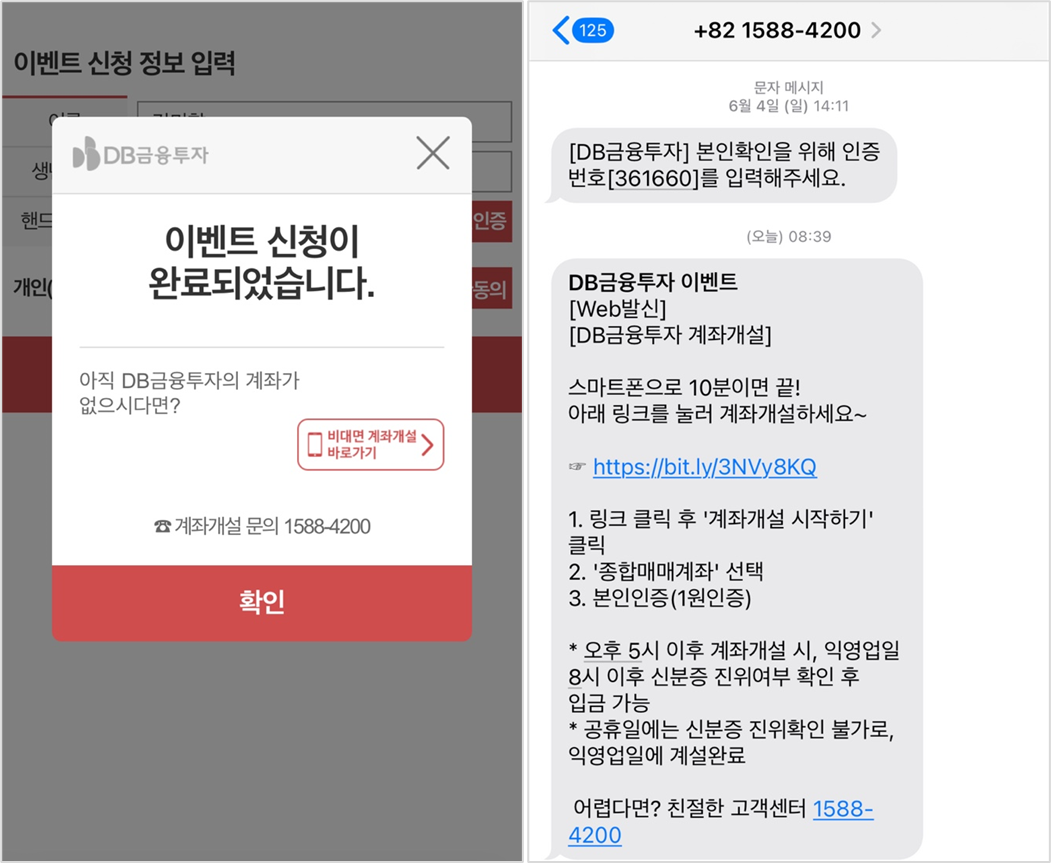 이벤트 신청 완료 후 문자로 계좌개설 링크가 옮니다.