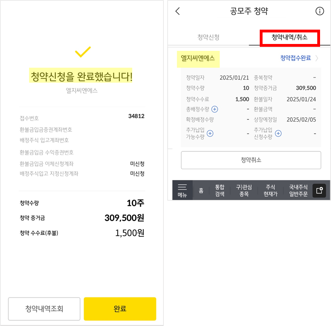 내가 엘지씨엔에스 공모주 청약을 제대로 했는지 확인하고 싶으시다면 청약내역에서 확인하실 수 있습니다.